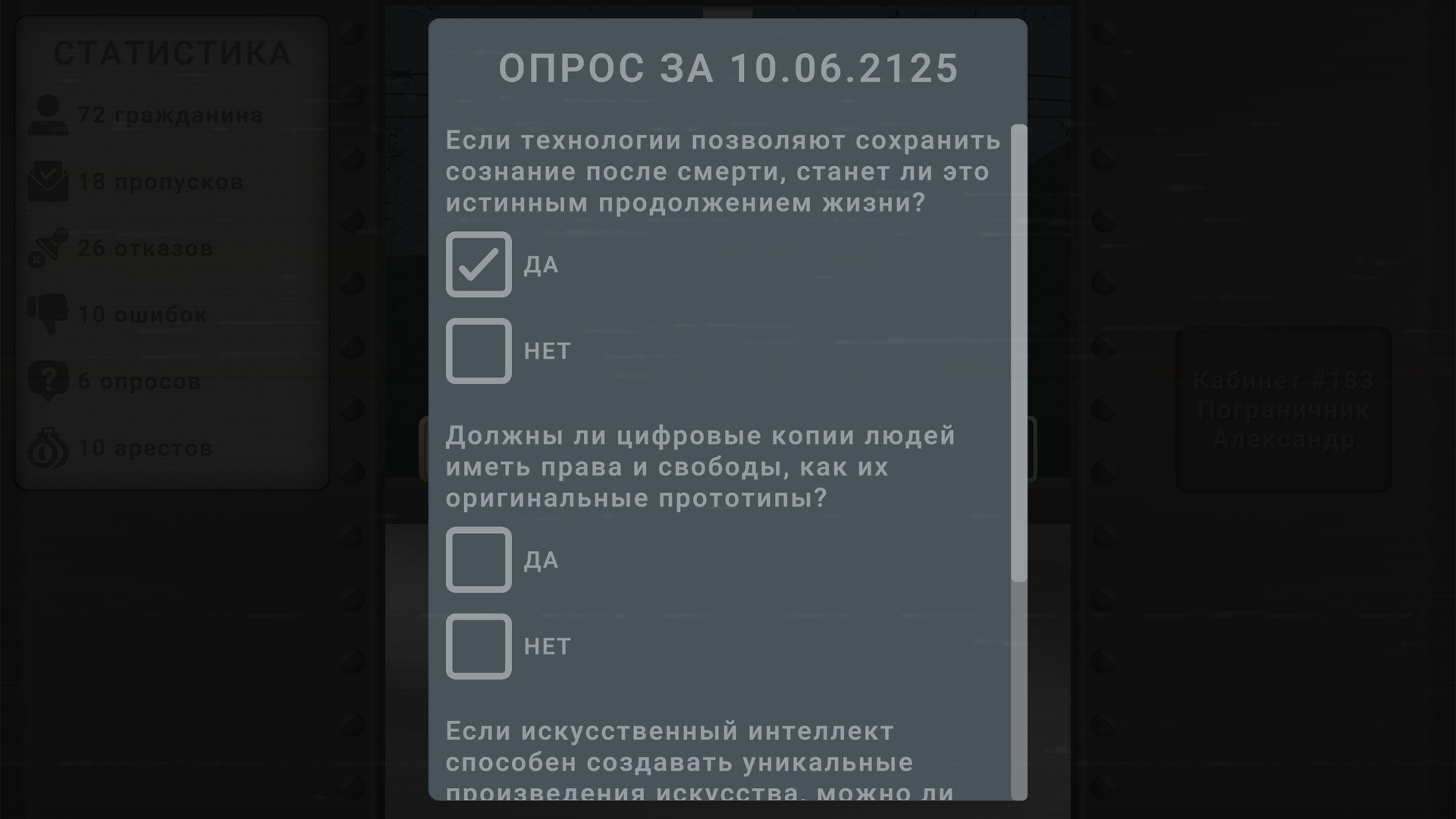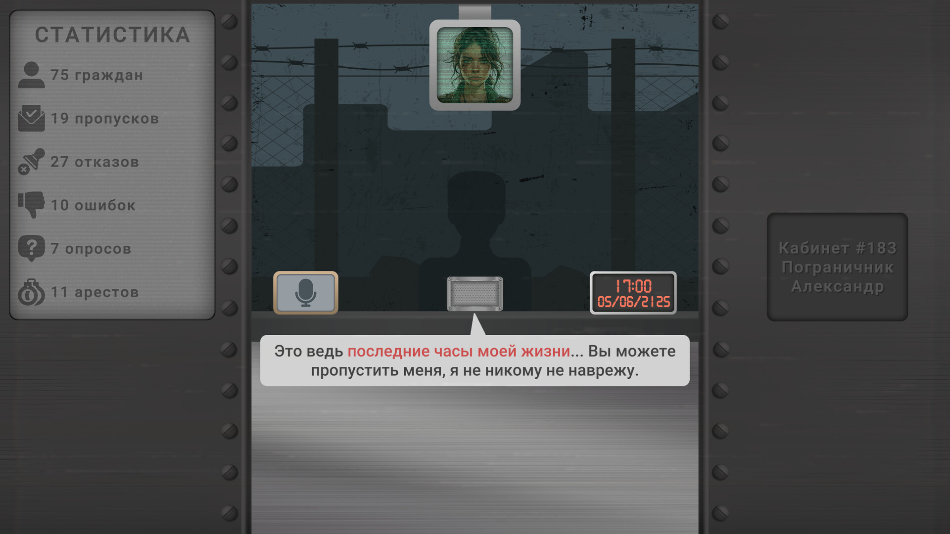 Твоя основная задача — проверка документов, и от твоего выбора зависит, кто пройдёт через пограничный пост. В твоих руках — не просто штамп, а жизнь человека: за каждым паспортом скрывается личная история, полная секретов и трагедий. Ты можешь стать героем для одного, но безжалостным монстром для другого. Твои решения могут привести к спасению, но могут и стать причиной гибели. Каждый выбор приводит к новой истории, а каждый акт доброты или жестокости отзывается в этом мире по-своему.