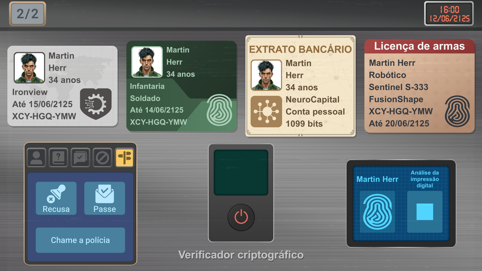 Sua principal tarefa é verificar os documentos, e depende da sua escolha Quem passará pelo posto de fronteira. Em suas mãos não está apenas um carimbo, mas a vida de uma pessoa: por trás de cada passaporte está uma história pessoal cheia de segredos e tragédias. Você pode ser um herói para um, mas um monstro implacável para outro. Suas decisões podem levar à salvação, mas também podem causar a morte. Cada escolha leva a uma nova história, e cada ato de bondade ou crueldade ressoa neste mundo à sua maneira.