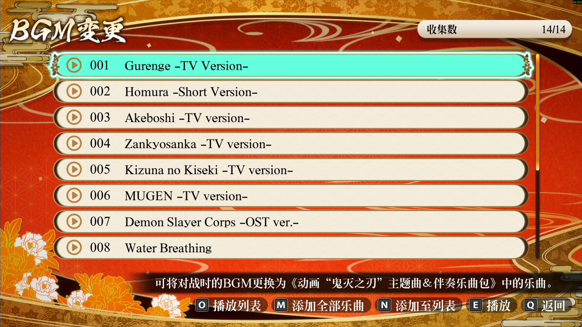 本乐曲包可在对战模式“对战”中,将对战时播放的BGM更改为动画“鬼灭之刃”中的主题曲或伴奏。
