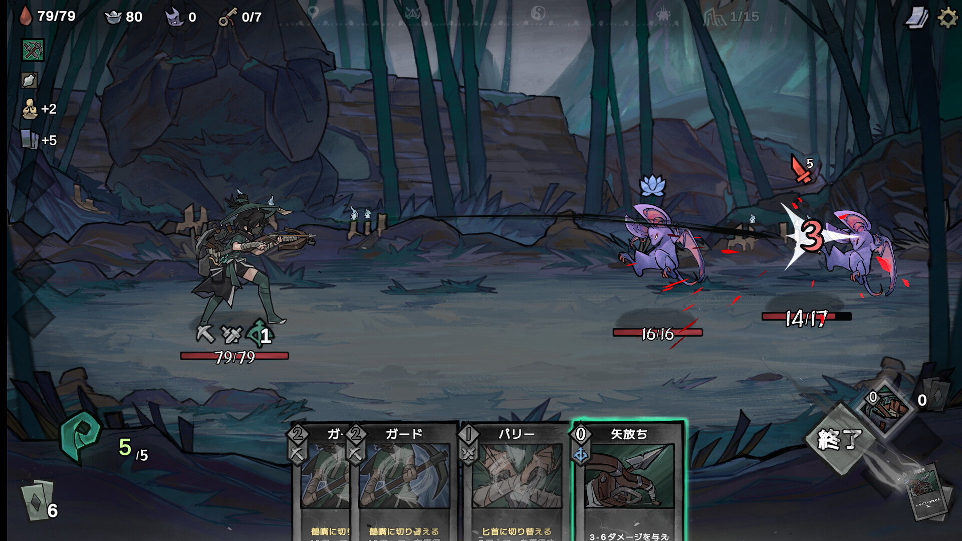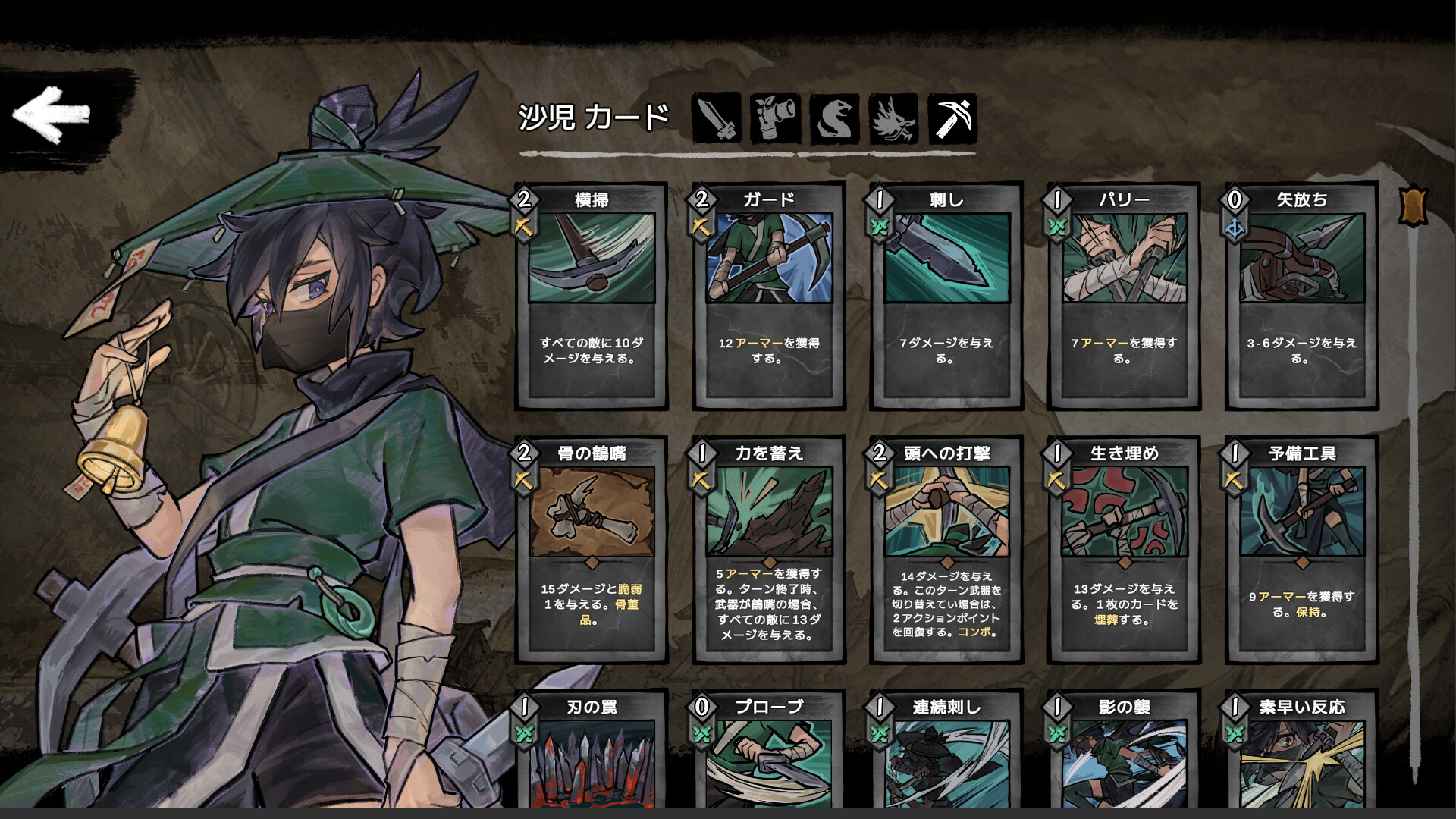 3種の武器を使い分ける:鶴嘴、匕首、弓矢