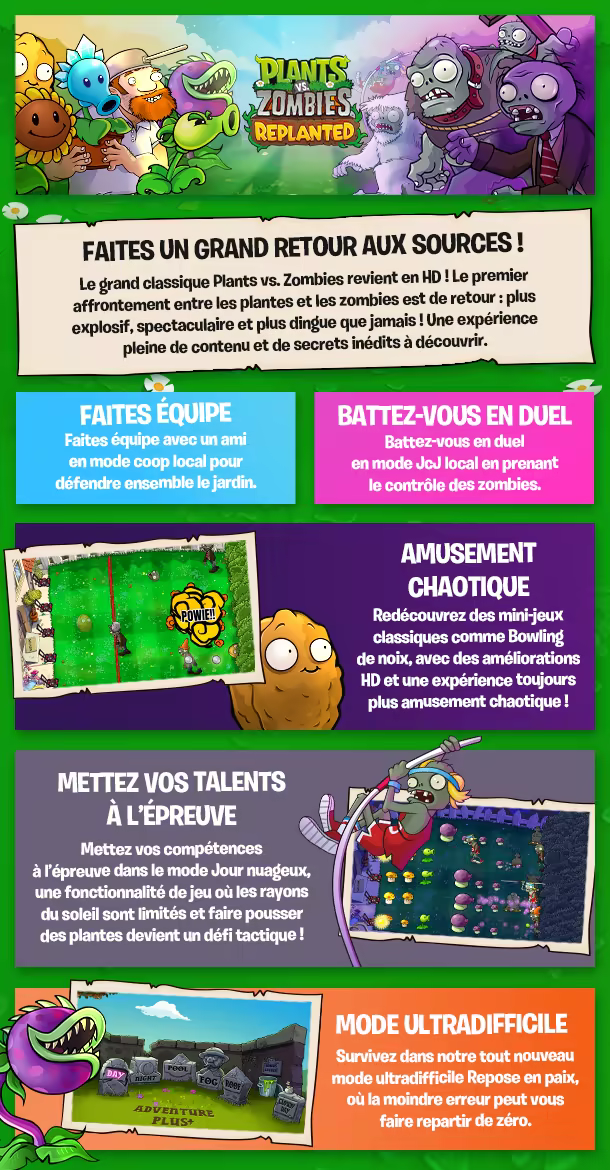 NOM D'UN PETIT ZOMBIE ! Le grand classique Plants vs. Zombies revient en HD ! Après de longues années dans le grenier de Dave le Dingo, le célèbre jeu de baston opposant les plantes aux zombies est de retour, plus grand, plus beau et plus dingue que jamais ! Découvrez ou redécouvrez l'expérience originale en version remastérisée, avec des graphismes HD et de nombreux secrets inédits.