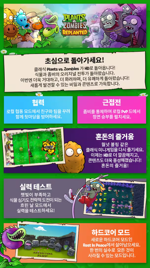 클래식 Plants vs. Zombies가 선명한 HD로 돌아옵니다! 식물과 좀비의 오리지널 전투가 더 크고, 더 밝고, 더 크레이지한 모습으로 돌아왔습니다! 모든 것이 시작된 게임을 리마스터된 멋진 HD 그래픽으로 다시 경험해 보세요. 새로운 비밀 요소도 가득합니다.