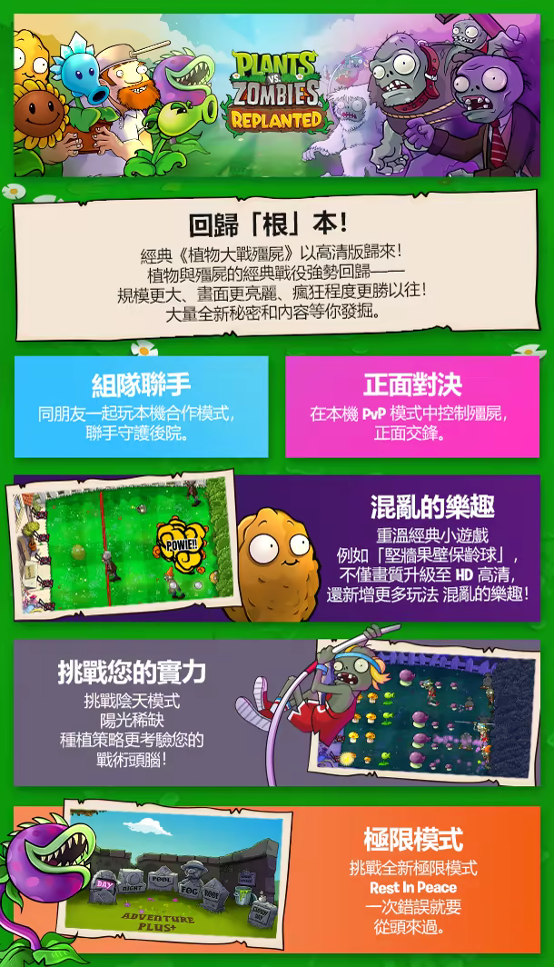 經典的《植物大戰殭屍》以 HD 高畫質榮耀回歸!天哪!原汁原味的植物對抗殭屍大戰重出江湖——更盛大、更白熱化、瘋狂度更勝以往!透過重製絕美 HD 高畫質版遊戲體驗最初的感動,還有滿滿的全新祕密與內容等你來一探究竟。