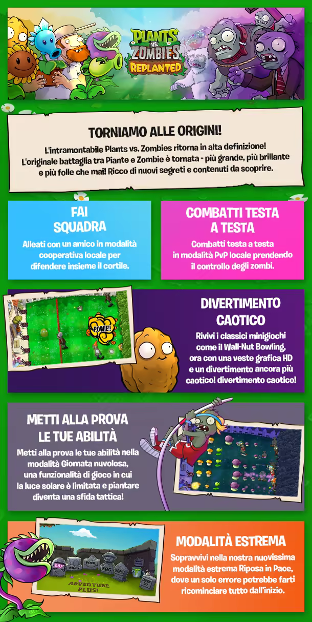 Torna alle epiche e indimenticabili sfide in cortile, questa volta con nuovi livelli, nuovi colpi di scena e 15 anni di storia della serie a portata di mano. Rivivi i giorni di gloria fatti di sparasemi, girasoli e caotici mangia-cervelli! Unisciti di nuovo alla difesa definitiva del giardino e vivi le risse in cortile che hanno dato inizio a un fenomeno. Di nuovo qui per una nuova era!