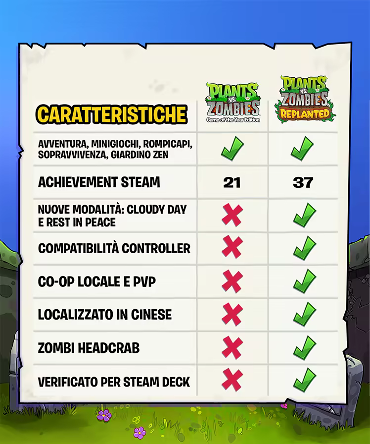 Torna alle epiche e indimenticabili sfide in cortile, questa volta con nuovi livelli, nuovi colpi di scena e 15 anni di storia della serie a portata di mano. Rivivi i giorni di gloria fatti di sparasemi, girasoli e caotici mangia-cervelli! Unisciti di nuovo alla difesa definitiva del giardino e vivi le risse in cortile che hanno dato inizio a un fenomeno. Di nuovo qui per una nuova era!