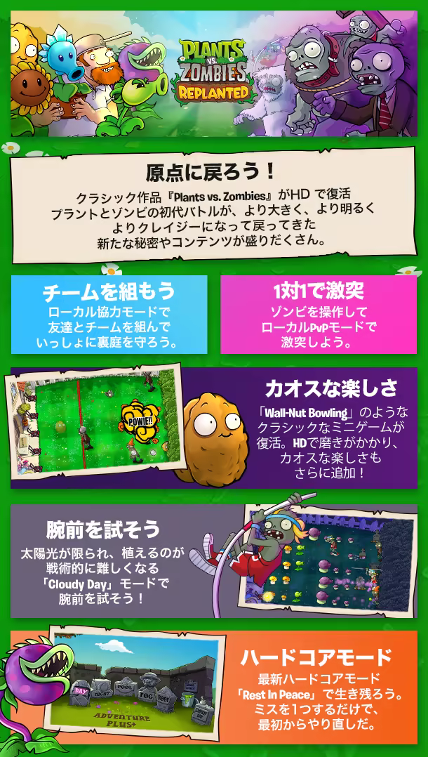 あの名作『Plants vs. Zombies』が、鮮やかなHDで帰ってきた!プラント対ゾンビのオリジナルバトルが、よりビッグに、より明るく、よりクレイジーになって復活!すべての始まりとなった伝説のゲームを、HDグラフィックでリマスターされた新たな姿で体験しよう。新たな秘密も満載だぞ。