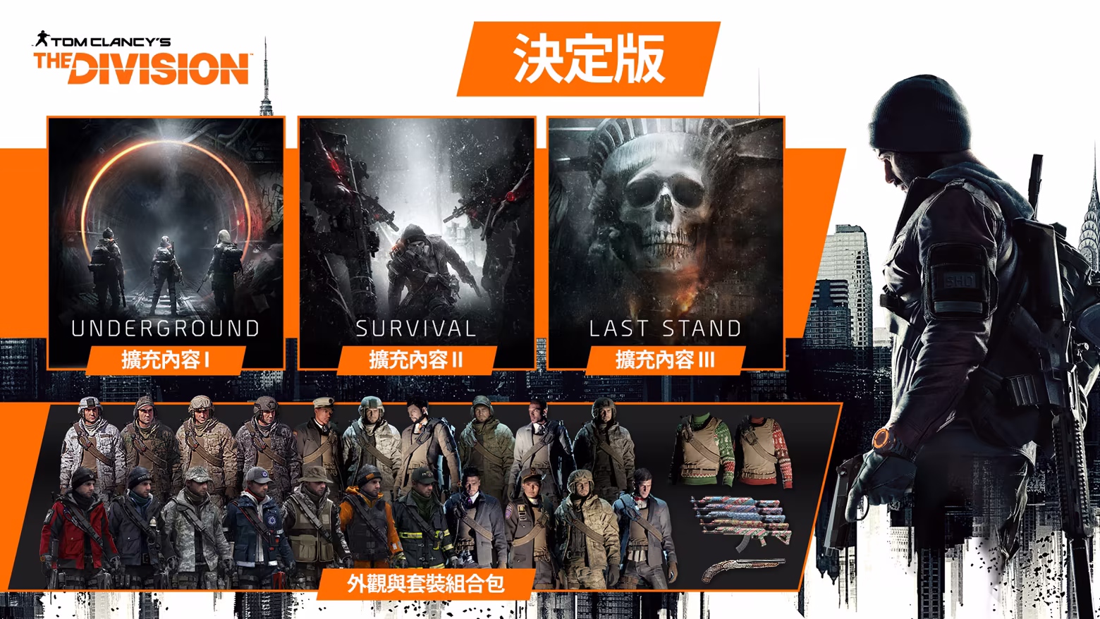在決定版中完整體驗《全境封鎖》!主遊戲、三款季票擴充內容,以及多款造型組合包等著各位。