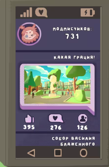 An adventure game about a blogger traveling around Moscow. Complete tasks, complete mini-games, take photos and gain subscribers to advance further!