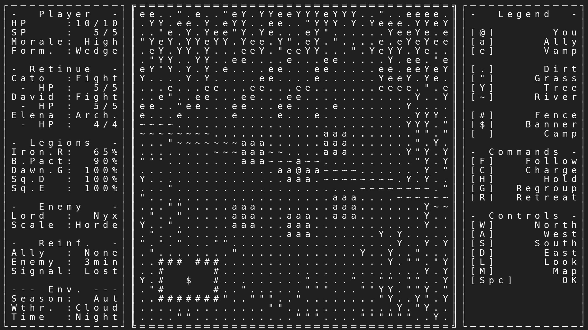 Command your elite retinue in massive medieval battles featuring large-scale, dynamic ASCII combat. Influence allied forces with banner signals and positioning, but expect no absolute control in the chaos of war.