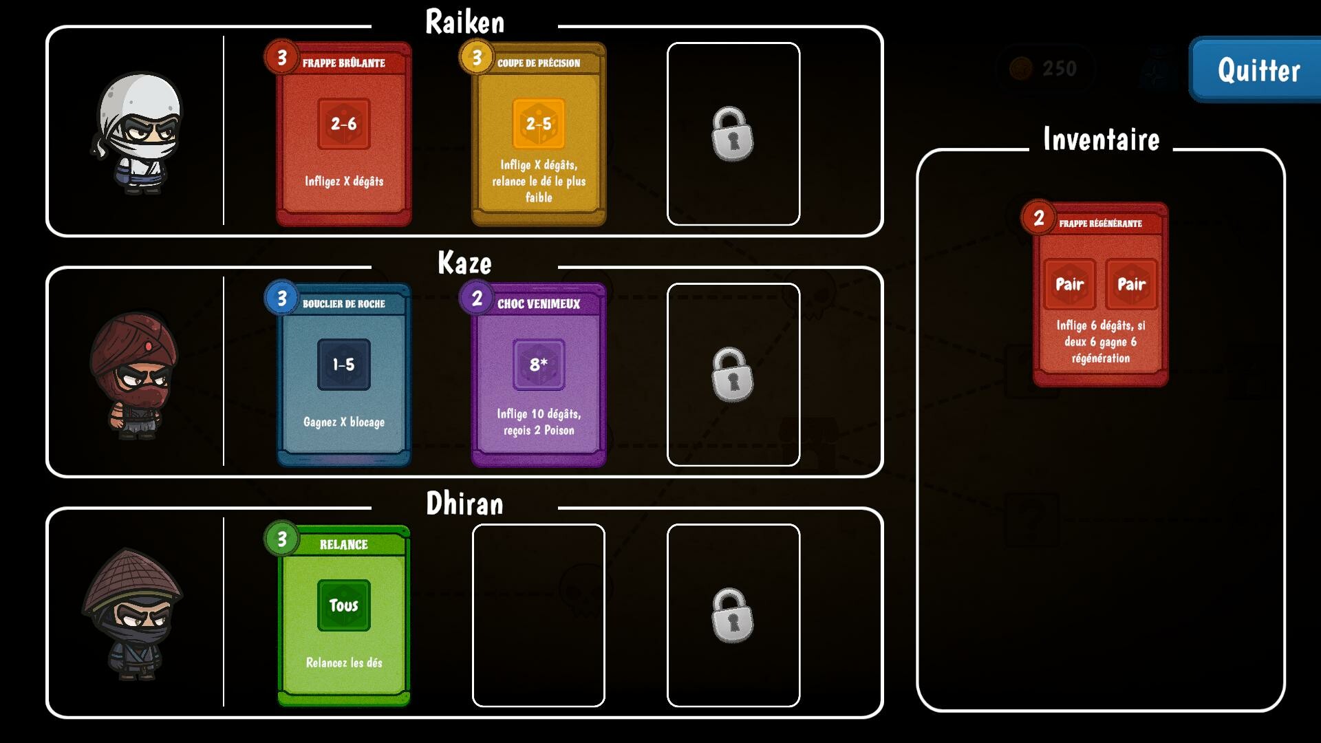 Maîtrisez l'art de la stratégie en gérant l'inventaire de votre escouade, en améliorant vos ninjas avec des améliorateurs puissants, et en utilisant vos jets de dés pour renverser la situation en votre faveur. Chaque mouvement compte alors que vous affrontez des ennemis implacables et tracez votre chemin vers la victoire.