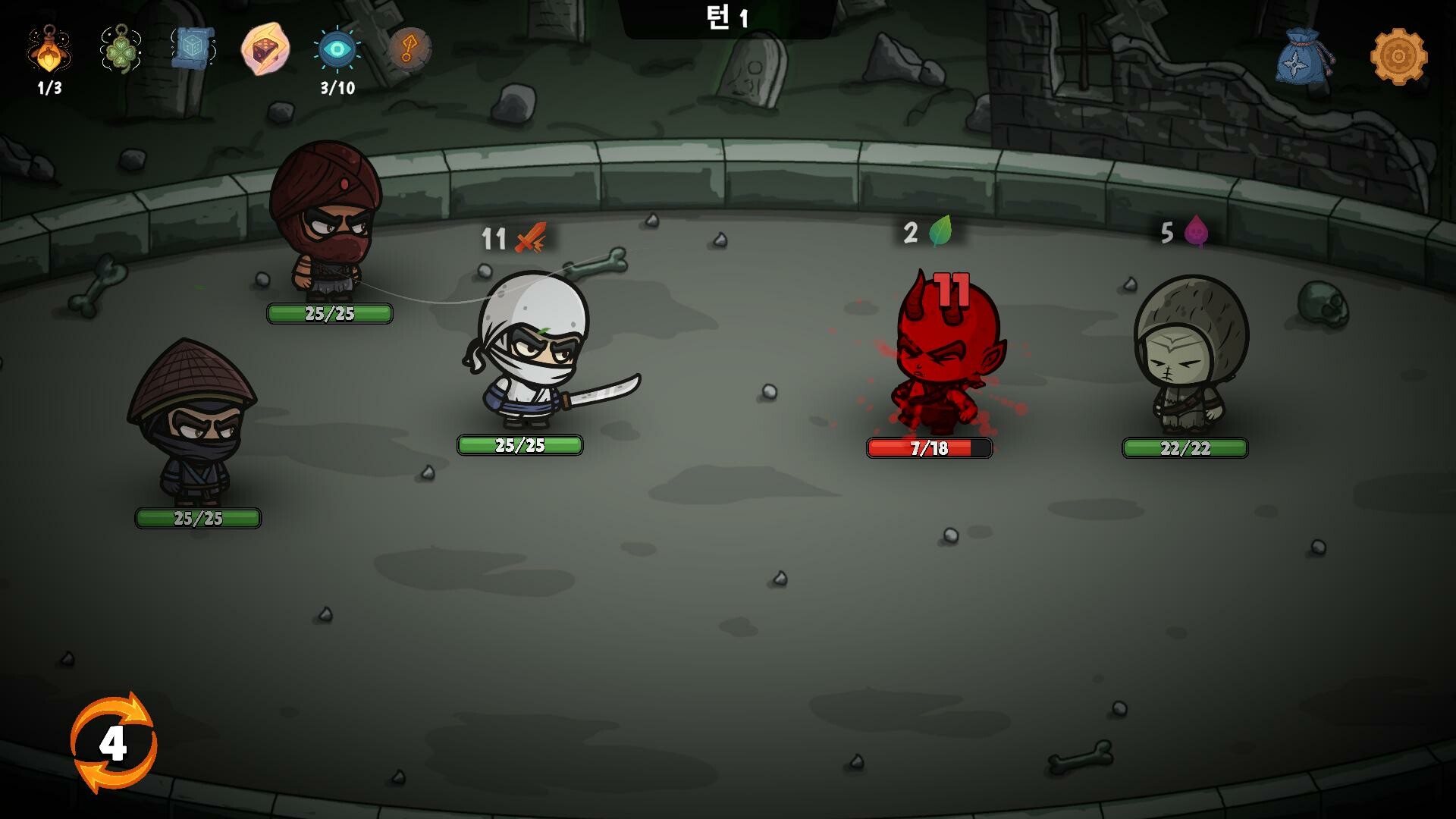 인벤토리 로드아웃 시스템: 각 닌자에게 인벤토리에서 강력한 카드를 배치하세요. 슬롯 수는 제한되어 있으며, 카드 효과는 다양하므로 세심한 계획이 전투에서 승리하는 열쇠입니다.