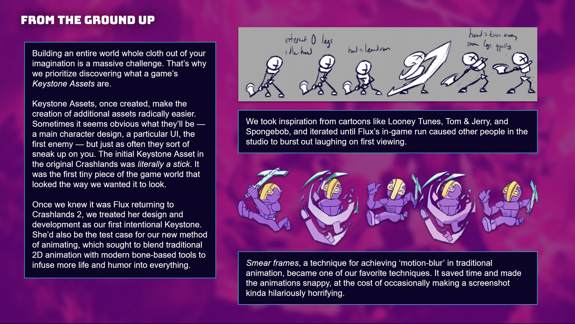 Crashlands 2 is an incredible labor of handcrafted love, from the tiniest Frug to the sluggiest Bun. This digital artbook gives you a glimpse into the messy, sprawling journey of how we created the game’s distinctive visual style, including some of the skills, tech, and tricks we developed along the way. Check out never-before-seen early sketches, concept art, and storyboards, and learn about the process involved in turning a rough idea into a living part of the world of Crashlands 2.