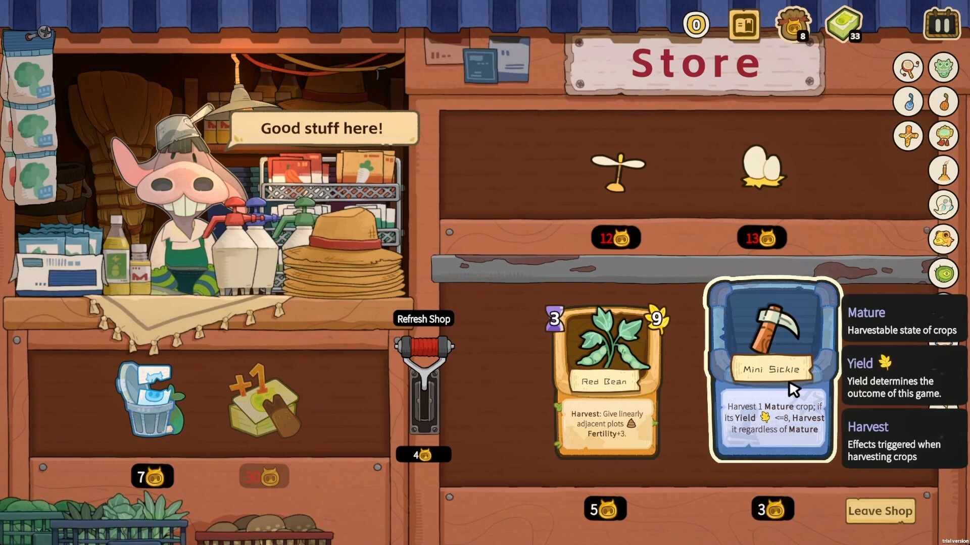 Start with a simple sickle. Save up, and you're not just upgrading to a harvester—visit the shop for relics, key cards, a bigger hand, or deck trimming. Upgrade your tools and refine your deck to take on any season.