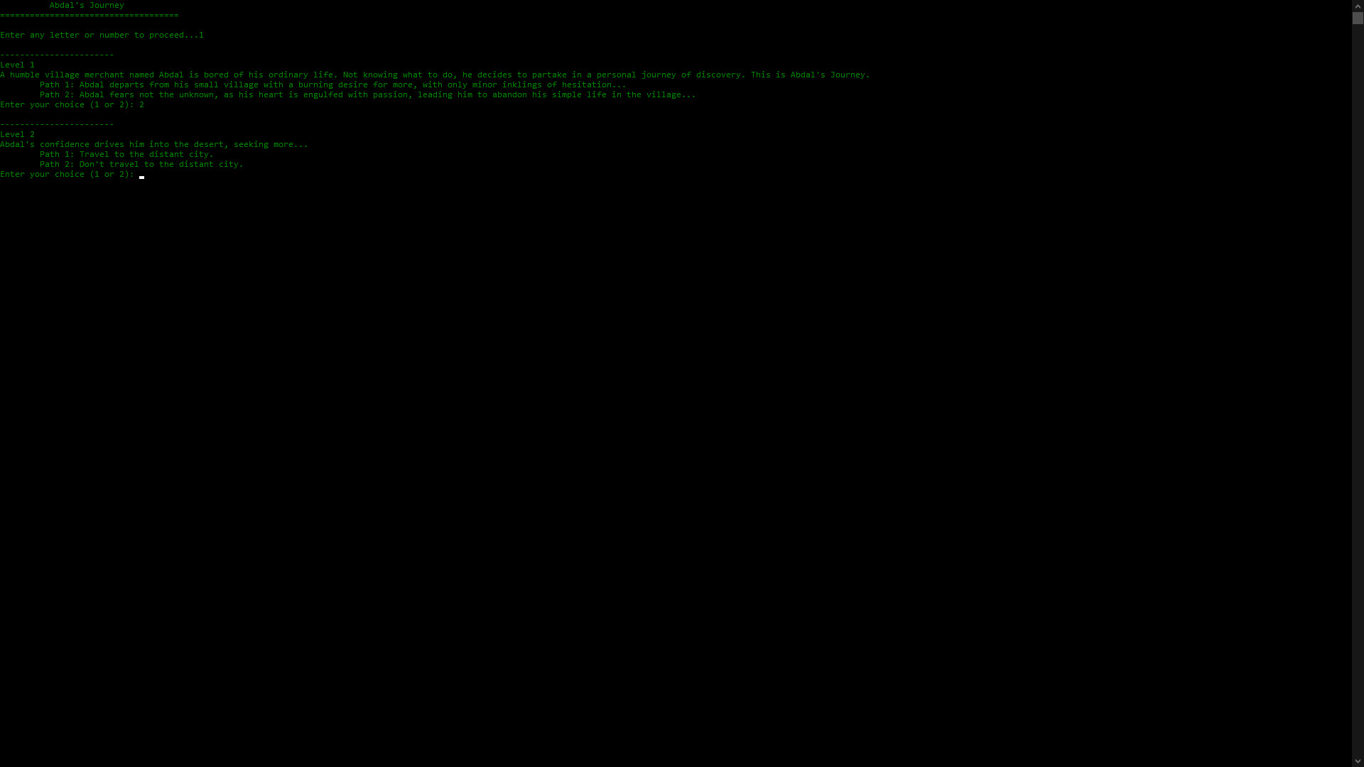 The Legend of Abdal is a classical text-based RPG set during the Mughal Empire in 1817. At each level, you will be faced with choosing between 2 decisions, entering "1" or "2" to make your choice.