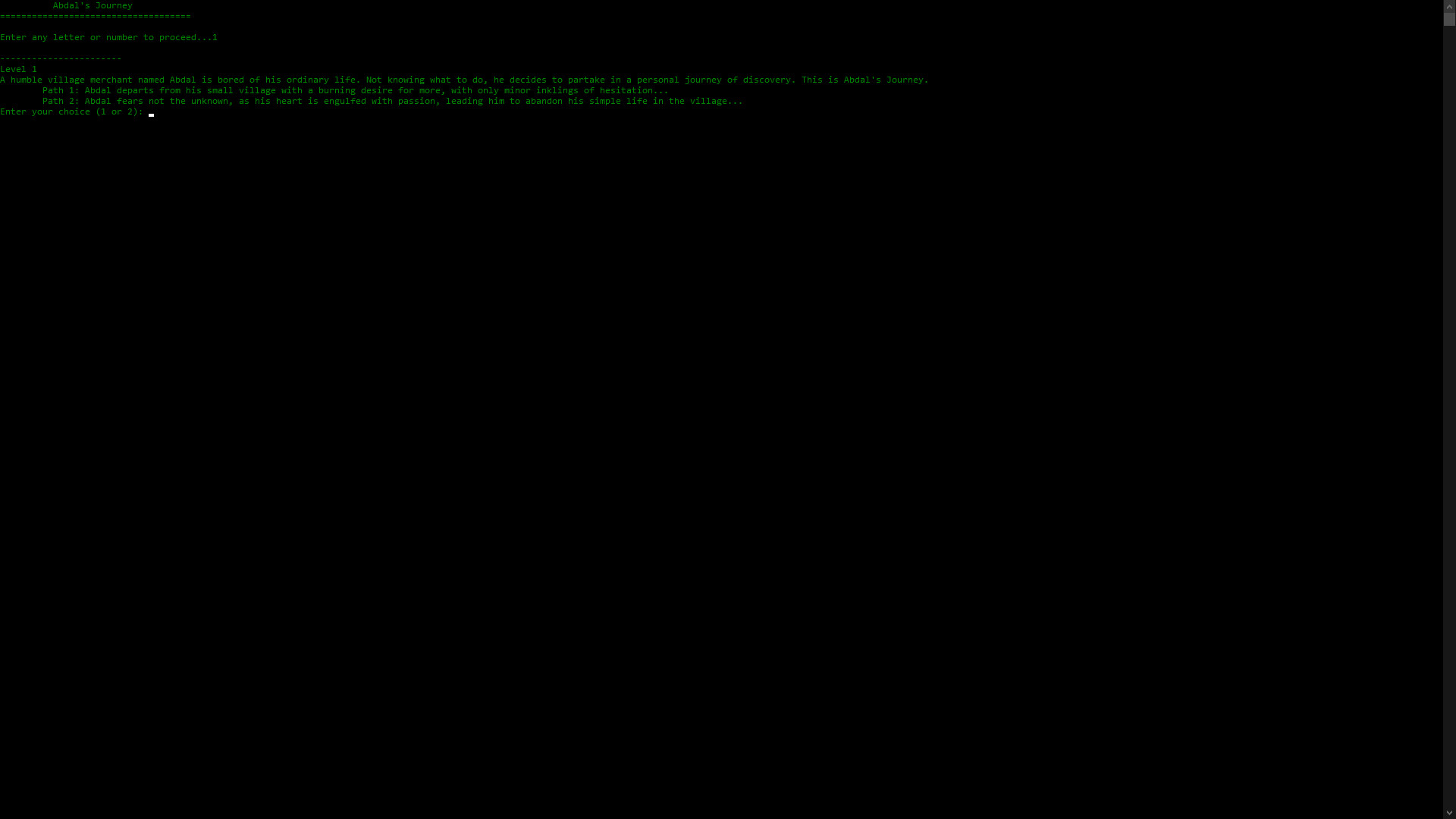 The Legend of Abdal is a classical text-based RPG set during the Mughal Empire in 1817. At each level, you will be faced with choosing between 2 decisions, entering "1" or "2" to make your choice.
