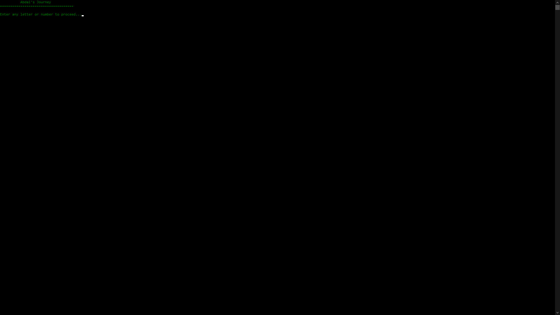 The Legend of Abdal is a classical text-based RPG set during the Mughal Empire in 1817. At each level, you will be faced with choosing between 2 decisions, entering "1" or "2" to make your choice.