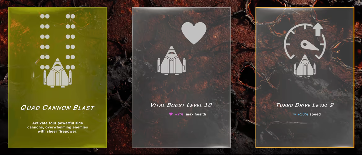 Death is only the beginning. Earn permanent upgrades for your starship that carry over between runs. Unlock 10 ship classes, each with different starting weapons.