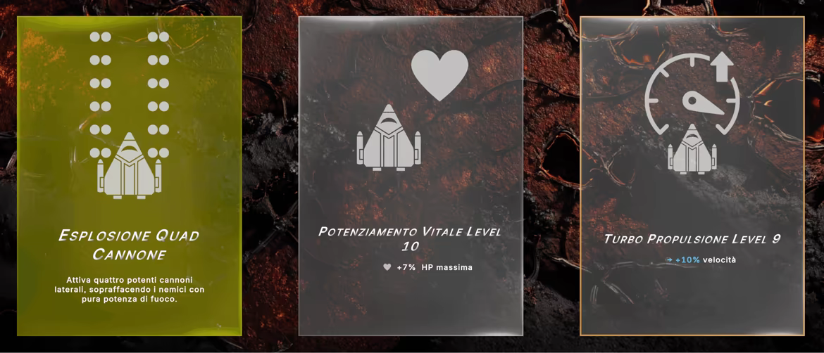 La morte è solo l'inizio. Guadagna potenziamenti permanenti per la tua astronave che si trasferiscono tra una partita e l'altra. Sblocca 10 classi di navi, ognuna con armi iniziali diverse.