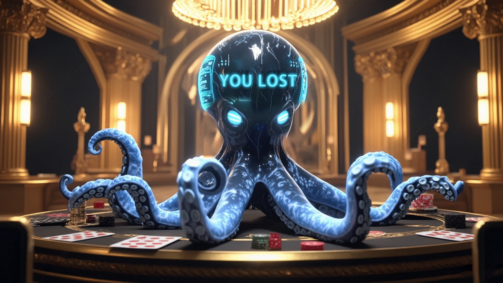 AI Croupier "Chronotopus": A biomechanical elder god dealing cards with tentacle grace, its screen-face flashing debtors' final moments