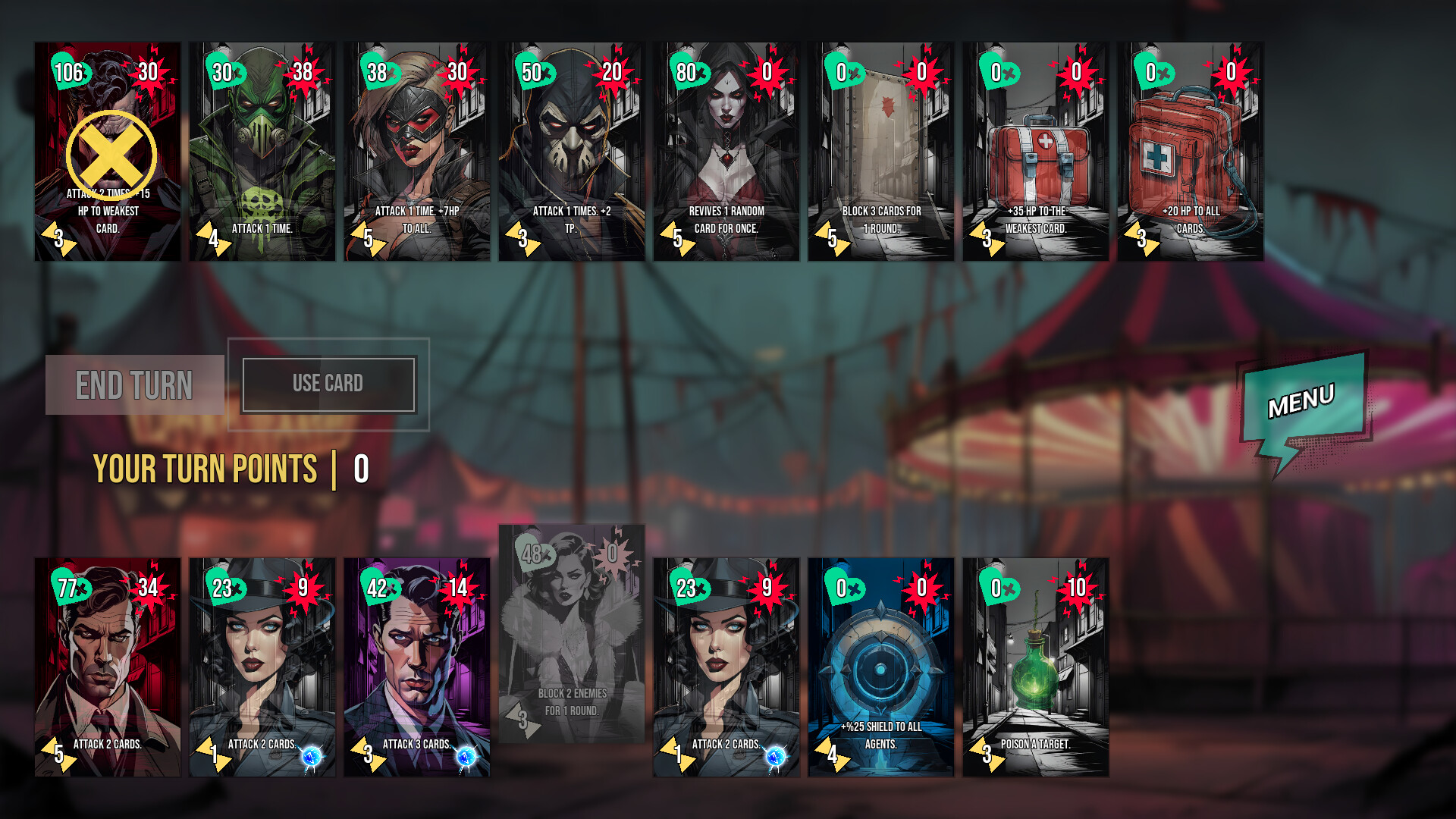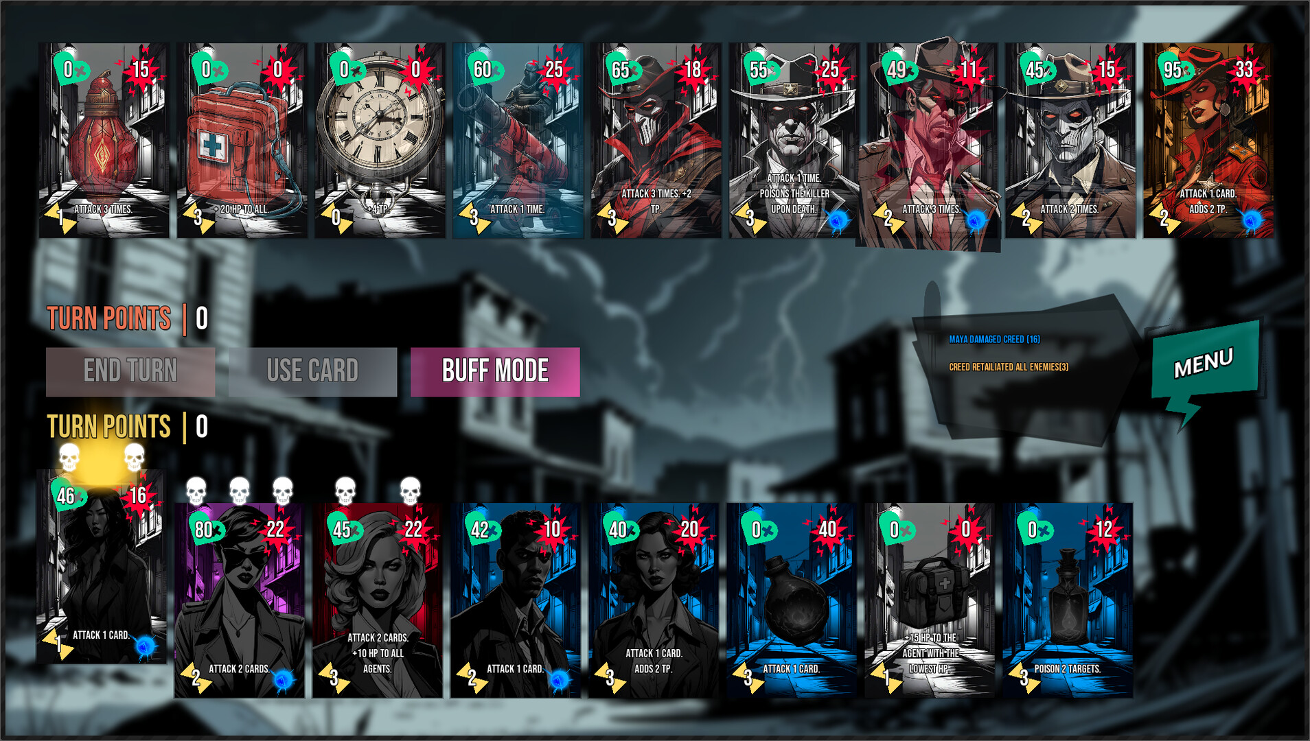 A fast-paced single-player card battler with tactical choices, quick rounds, and upgradeable cards. Build your deck and outsmart the city’s crime lords.