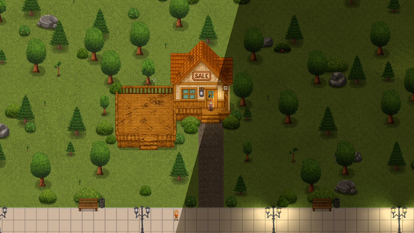 • Pixel art world inspired by Stardew Valley and Twin Peaks