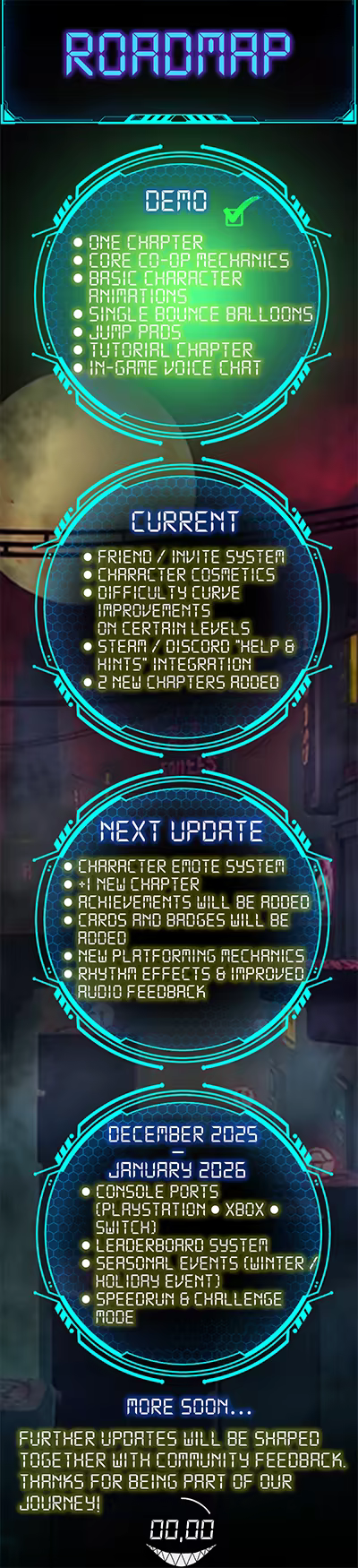 Ticking Together is a 1-4 player co-op platformer set in a high-stakes cyberpunk world. Carry a bomb through deadly obstacle courses, reset its timer with a hand scan every 15 seconds, and work together to prevent a catastrophic city-wide explosion.