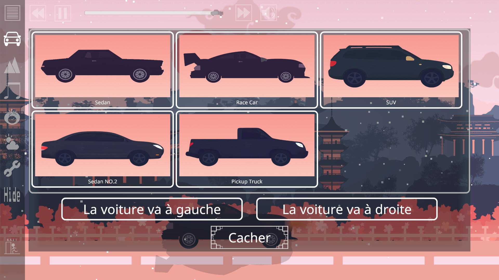 La version complète proposera cinq modèles de voitures (avec la possibilité d'en ajouter d'autres à l'avenir) parmi lesquels vous pourrez choisir (la version DEMO propose deux modèles). Vous pourrez également contrôler la direction de la voiture, à gauche ou à droite.
