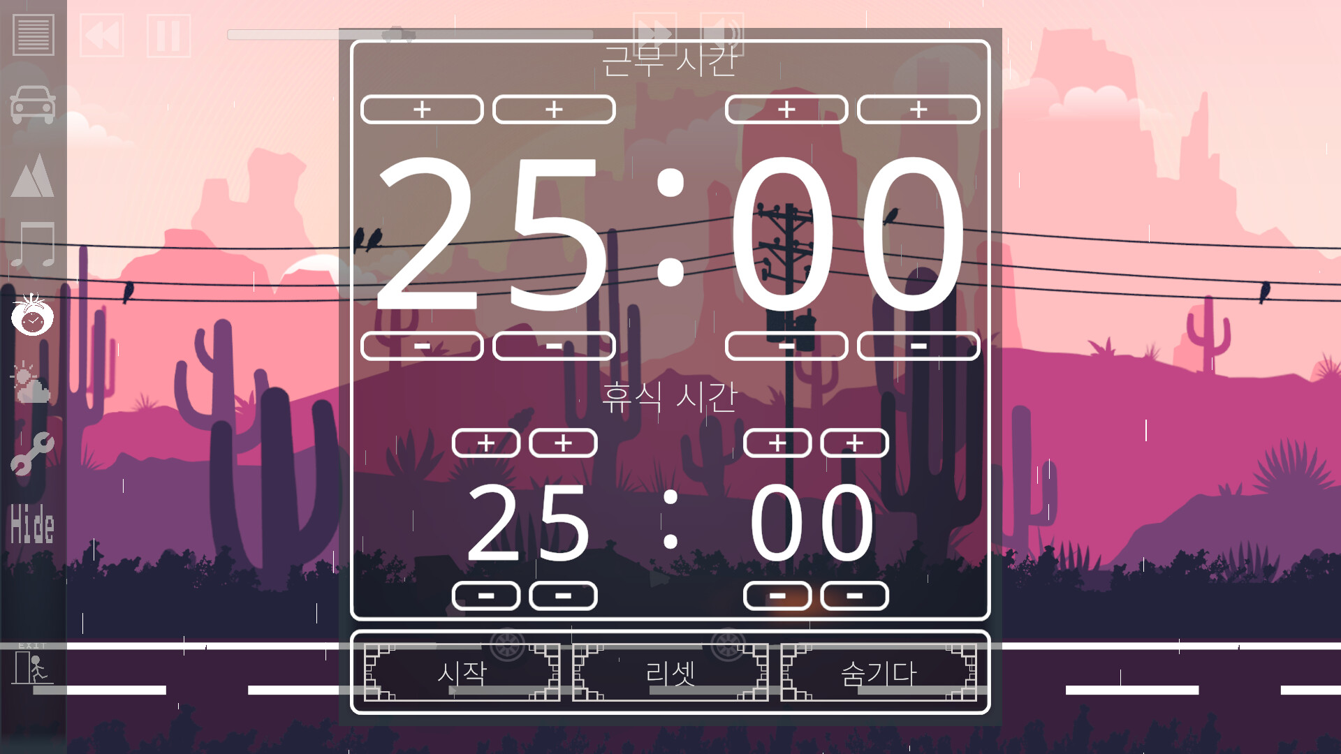Drive And Unwind — 작업과 학습을 위한 부드러운 동반자 Drive And Unwind는 2D 패럴랙스 배경, 차량 및 날씨 선택, 다섯 가지 음악 장르와 포모도로 타이머 기능을 갖춘 가볍고 편안한 도구로, 작업이나 학습 중에 편안하게 휴식을 취할 수 있습니다.
