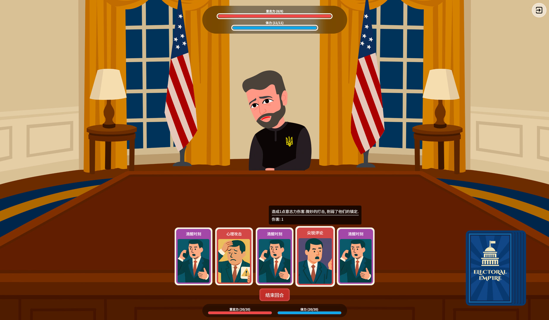 你是新上任的美国总统,面对一个价值观分裂且经济不稳定的国家。你会重建民主,还是趁乱夺权、改写法律、永远执政?这是一款深度政治模拟+卡牌游戏,你的工具是宣传、外交与背叛。