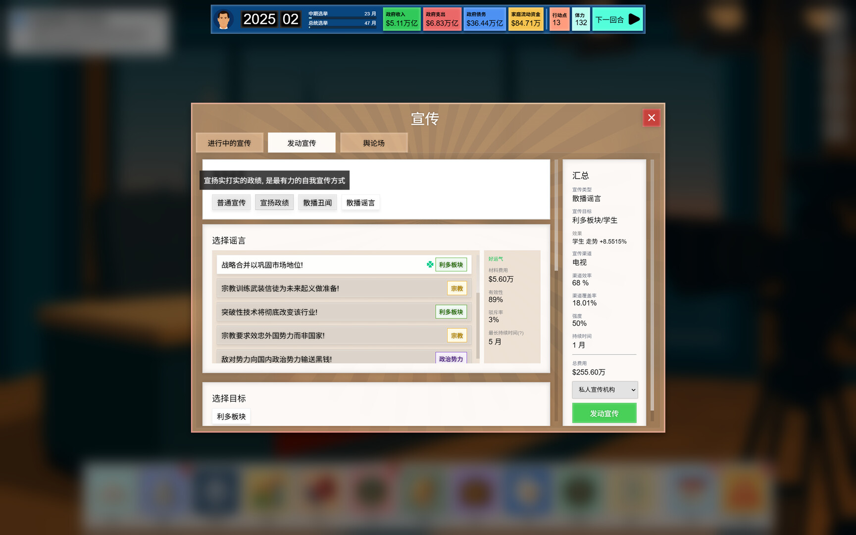 “当前版本已经具备完整的核心玩法循环,玩家可以体验政治谈判、政策制定、事件选择等主要机制。部分系统(如高级战争、情报与宣传扩展)仍在开发中,我们会在抢先体验阶段逐步加入这些内容。”