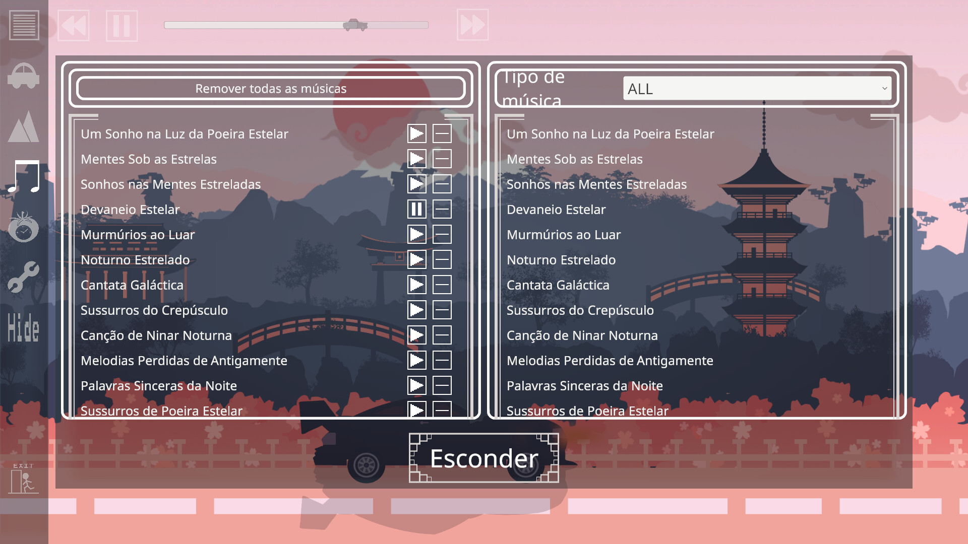 Esta é uma ferramenta relaxante chamada "Drive and Unwind", projetada para ajudá-lo a relaxar e acompanhá-lo durante o trabalho e o estudo. Ela oferece fundos em parallax 2D, apresentando diferentes paisagens de todo o mundo.