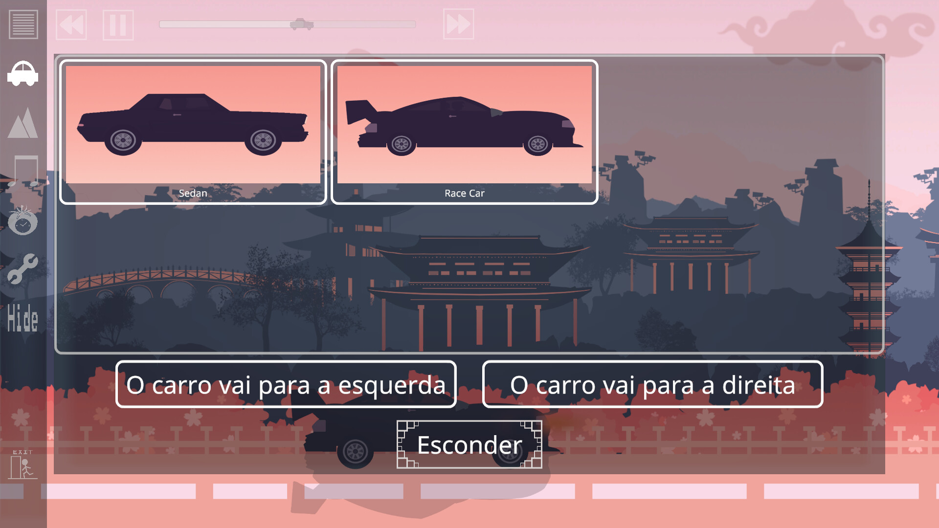 A versão completa oferecerá cinco modelos de carros (com a possibilidade de adicionar mais no futuro) para você escolher (a versão DEMO oferece dois modelos). Você também pode controlar a direção do carro, dirigindo para a esquerda ou para a direita.