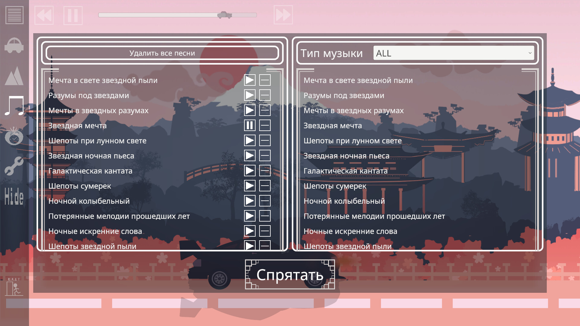 На старте полная версия будет содержать 69 музыкальных треков, разделенных на пять жанров (LO-FI, POP, SONG, EAST ASIAN, BOSSA NOVA). В DEMO-версии доступно 10 треков в трех жанрах (LO-FI, POP, SONG).