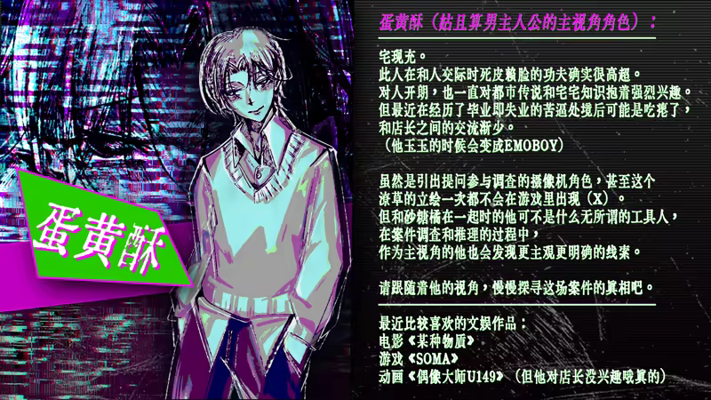 This game is a mystery visual novel where all characters are adults, portrayed in a distinctive artistic style. The story contains no sexual violence or sexual acts (not even kissing), with absolutely no pornographic depictions or dialogue. While there are romantic elements between male and female characters, these are presented without explicit language, and the CG artwork contains no sexual content (trust me, nobody would view my art style through a sexual lens). Regarding violence, deceased characters and descriptions of corpses exist solely to provide investigative clues, not for gratuitous gore. All graphical depictions are artistically stylized—no sensitive body parts are exposed, no explicit displays occur, and dismembered limbs are represented through black silhouettes with text collage effects.