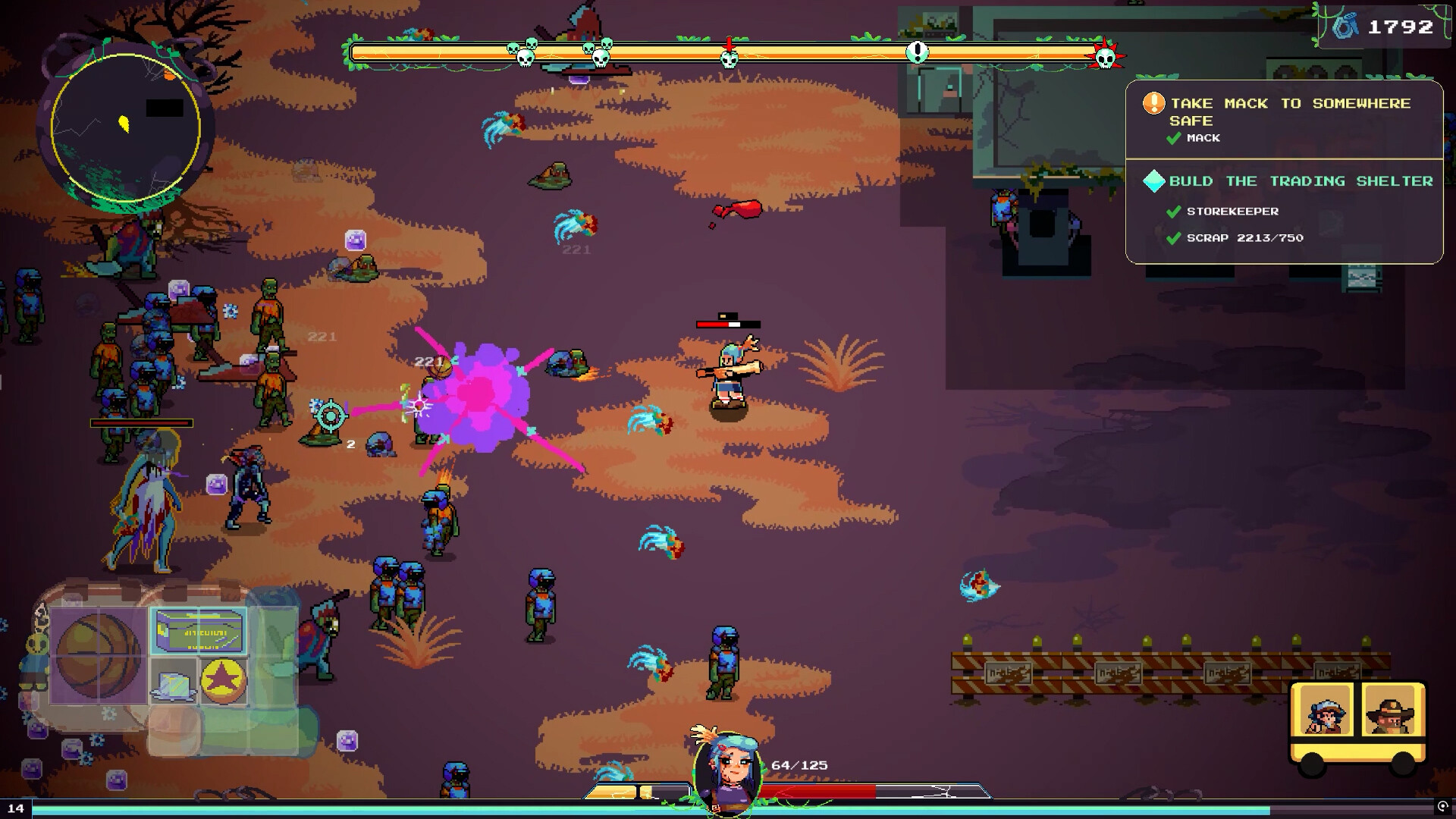Our post-apocalyptic world comes alive through hand-drawn pixel art, where every corner of the carefully crafted maps holds strategic potential. Plan your escape routes, set clever traps, and transform city ruins into deadly obstacles. Your survival depends on how well you use the terrain against the zombie hordes