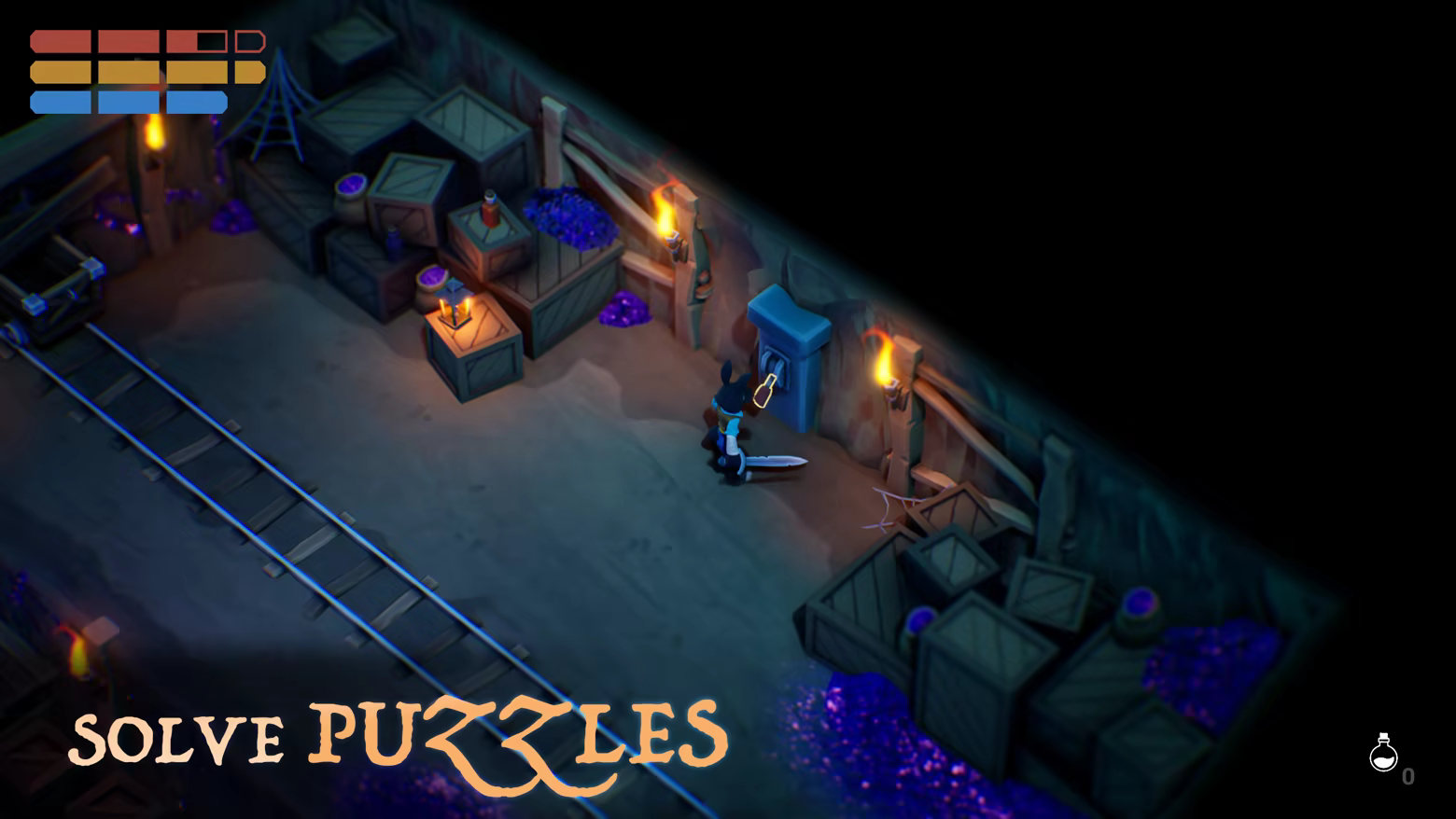 Navigate a dangerous underground dungeon full of brain-teasing challenges. Move boxes, pull levers, leap across collapsing platforms, and ride ore buckets through an ancient pulley system.
