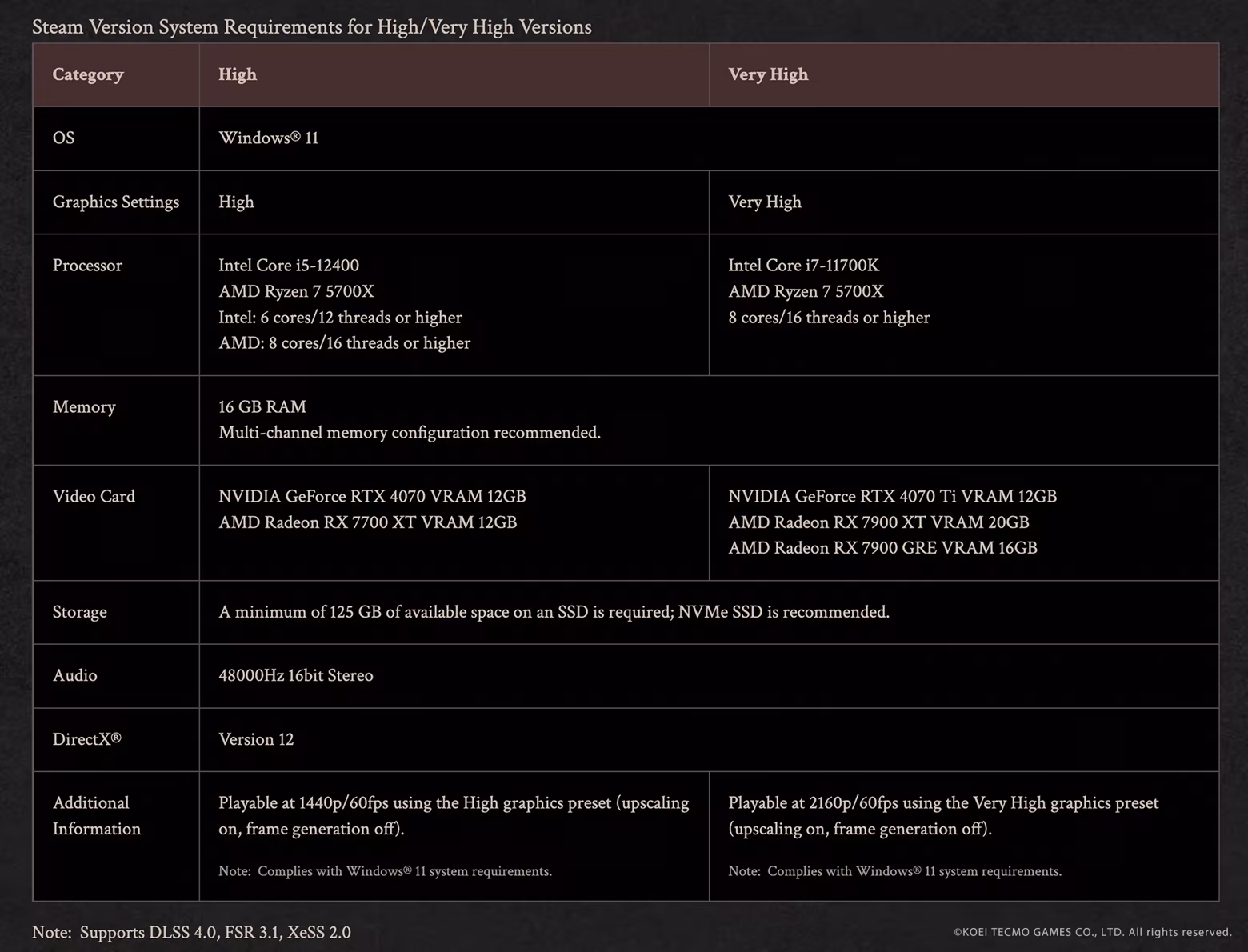• Additional Notes: Multi-channel memory configuration recommended. SSD is required. Gameplay performance may be affected if the SSD’s performance is insufficient. Playable at 1080p / 30fps using the ‘Lightest’ graphics preset (with upscaling). Frame generation is supported. Note: Complies with Windows® 11 system requirements.