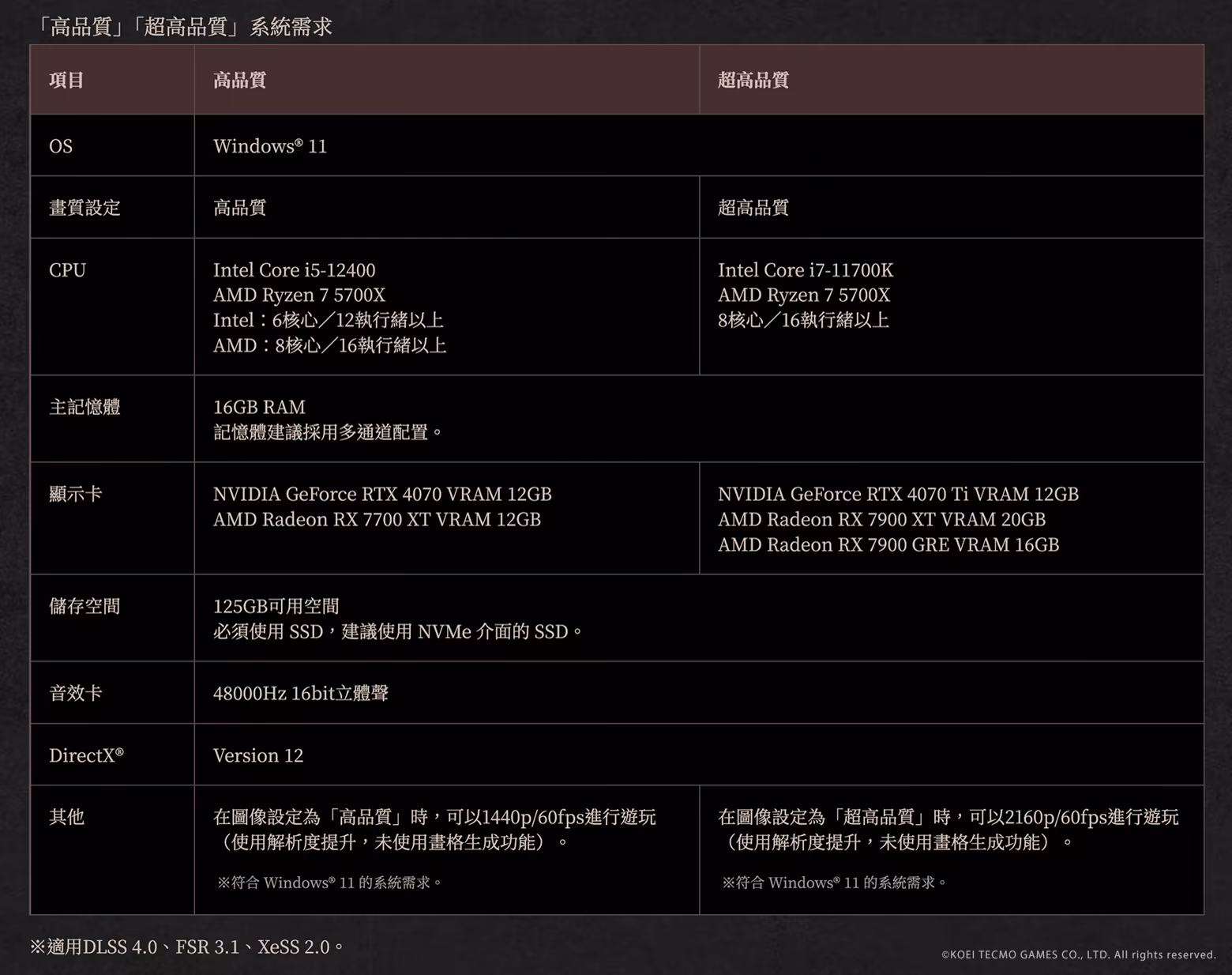 • 備註: 記憶體建議採用多通道配置。必須使用 SSD。若 SSD 效能不足,可能會影響遊戲體驗。在圖形設定為「最輕量」時,可於 1080p・30fps 進行遊玩(使用升頻)。 可使用幀生成功能。※符合 Windows® 11 的系統需求。