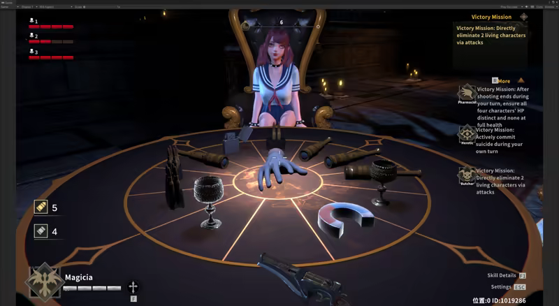 This multiplayer strategy game ​​blends​​ Russian Roulette ​​with​​ Mafia gameplay. You’ll be randomly assigned roles:[Butcher/Pharmacist/Magician/Heretic]. Each role has its own victory mission: conceal your identity, deduce others’, use items and skills. Lock onto your target: Bang! One More Bang!