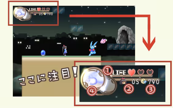 • 1) ライフ - このハートはとばりのライフです。彼女のやる気!とばりの好きなものを食べるともっと増えるかもしれません。
