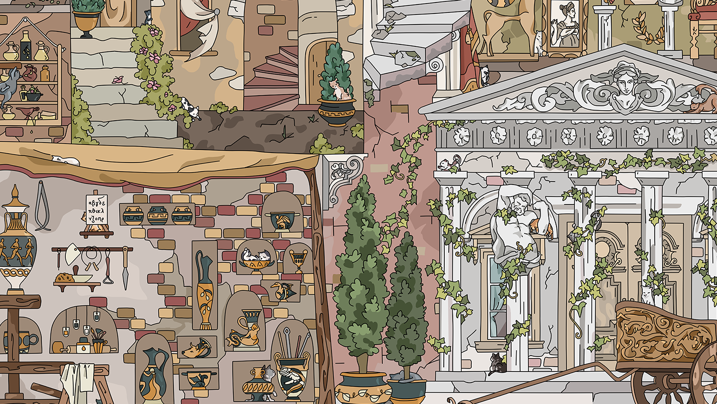 Explore this mysterious Ancient Rome world in the new game Hidden Cats: Rome finding cute cats and paint black - white locations with colored paints.