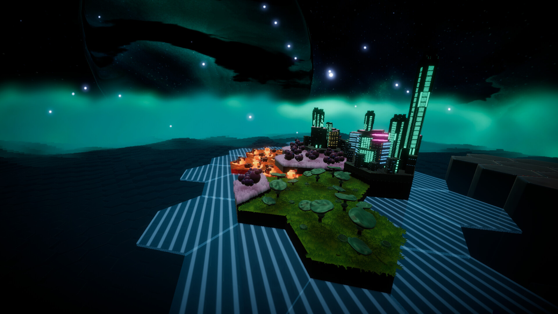 • Neon-eco sci-fi aesthetic with glowing hexes