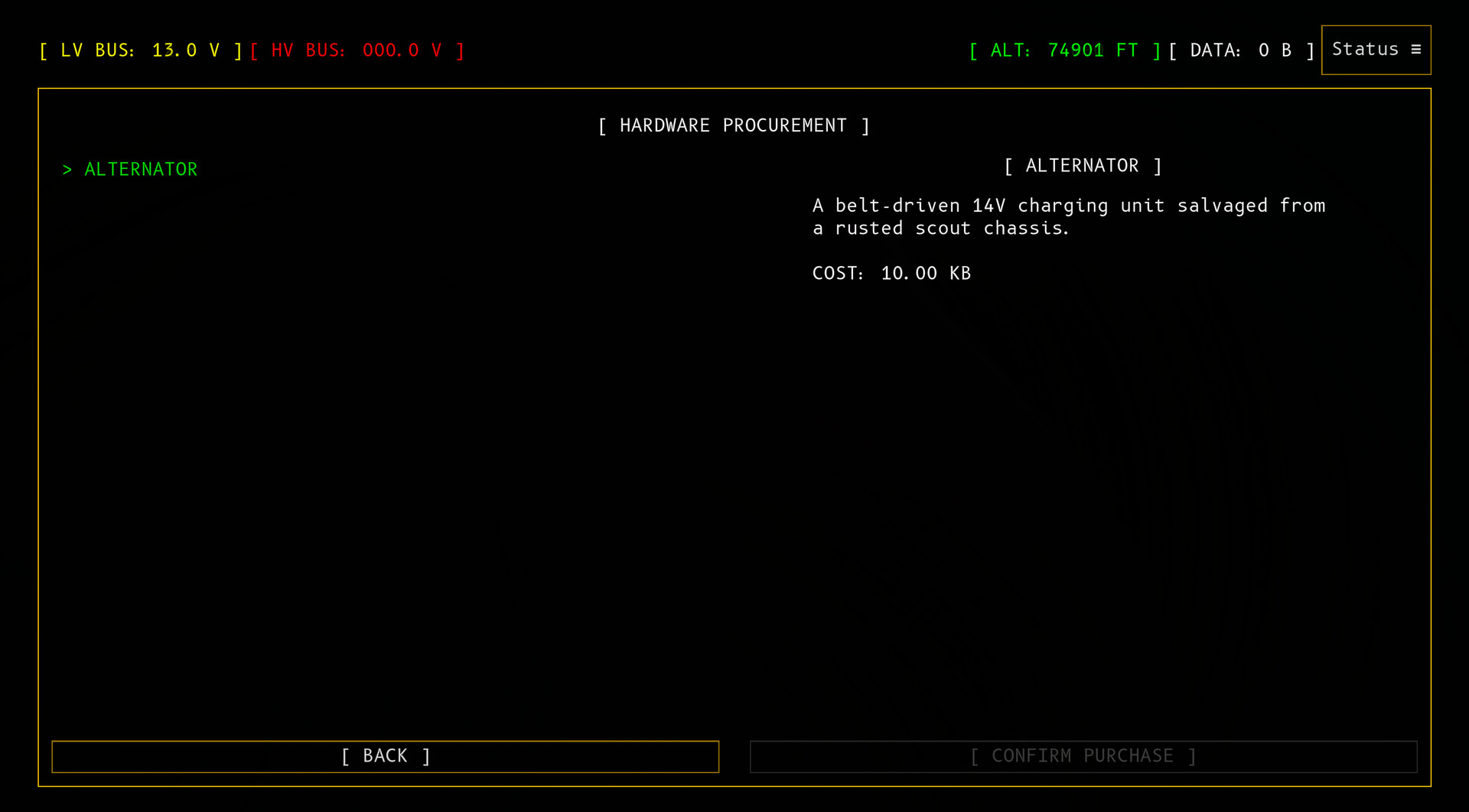 • Retro avionics terminal aesthetic with monospace fonts and color-coded readouts