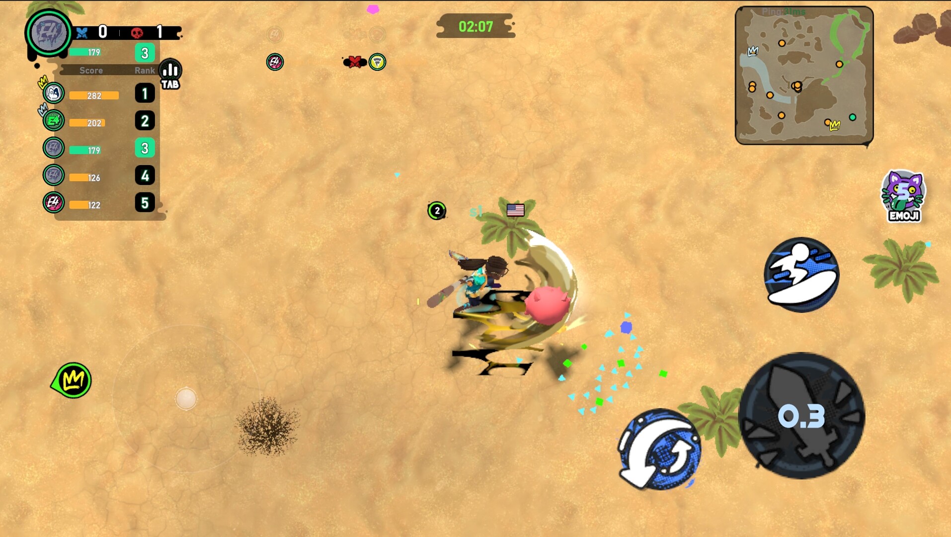 One of the works in the E4C series' universe.This is a 15-player battle royale arena game where players select a hero and enhance their level by collecting various types of randomly spawned gems within the arena. Character levels increase attack radius and ultimately determine the victor. Featuring fast-paced combat, any player hit by an attack instantly dies and respawns at a random location after 5 seconds. Through repeated gameplay, players can unlock more elaborate weapon skins and new heroes.