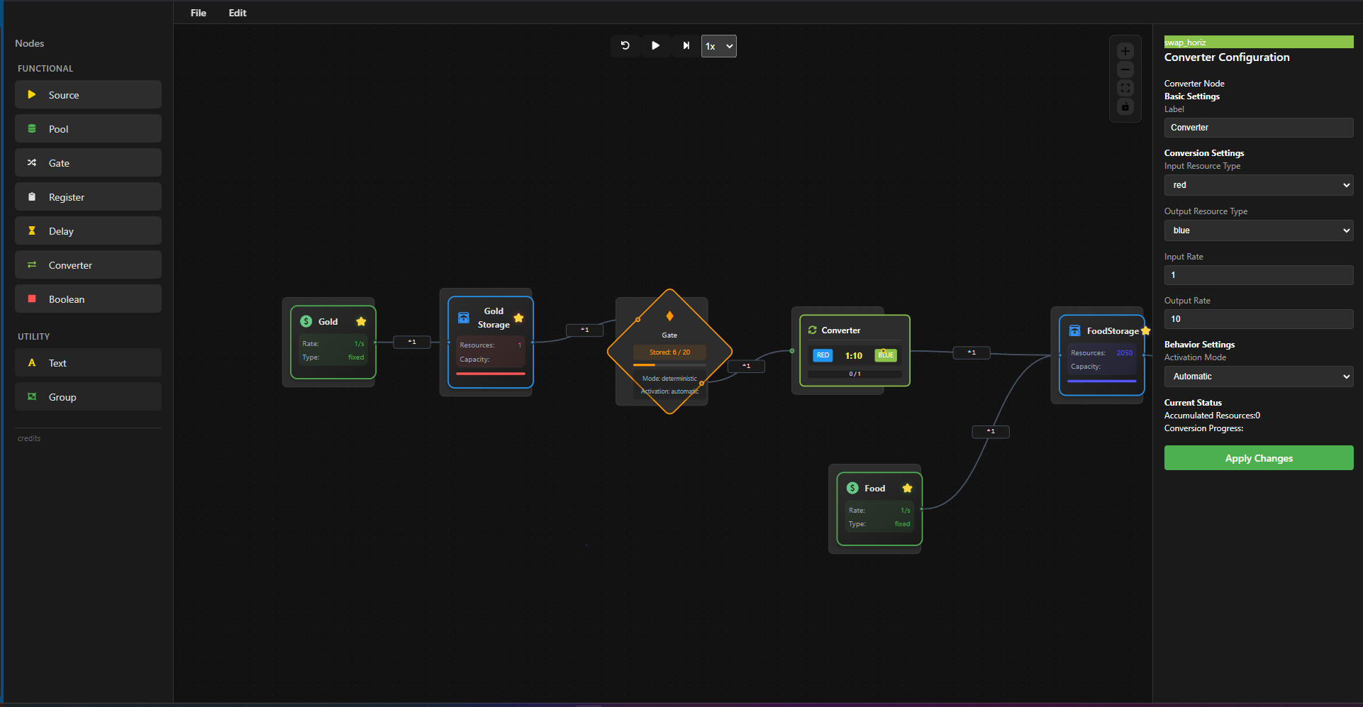 “All core features and workflows have been fully implemented. The system now includes a comprehensive set of fundamental nodes such as Source, Pool, Gate, Register, Delay, Converter, Drain, Condition, and Boolean nodes.