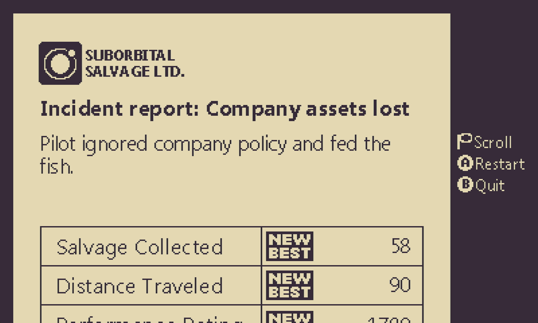 Test your piloting skills in this endless runner set in a dystopian corporate future! Fly your space ship through the dangerous, hazard-filled orbit of Cetos while collecting salvage. Oh, and please try not to feed the fish - your supervisor won't appreciate the policy violation.