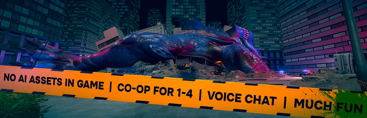 Clean up the aftermath of epic Kaiju battles in this brutal first-person simulator for 1-4 players. Carve up giant monster corpses, extract rare organs, operate heavy machinery, and wash away the blood and toxins polluting the city streets!