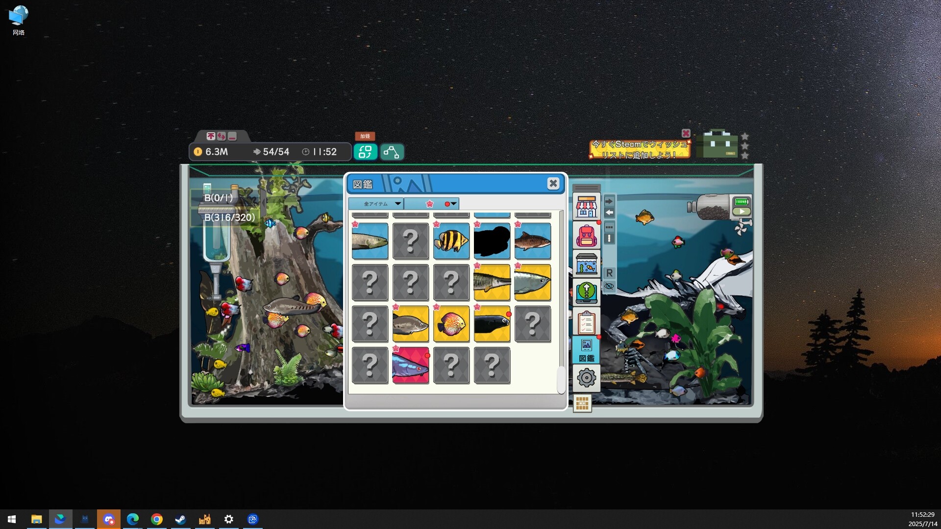 クラウンナイフ、ディスカス、ロングノーズガー……希少な魚たちがあなたのアンロックを待っています。稚魚パックを購入してガチャを回せば、淡水魚も海水魚も百種類以上の魚図鑑を解放可能。生態水槽にどんどん仲間を増やしていきましょう。仕事や勉強に疲れた時、デスクトップに広がる静かな癒やしをお忘れなく。運が良ければ、神話級の超レア魚苗が出るかも…?