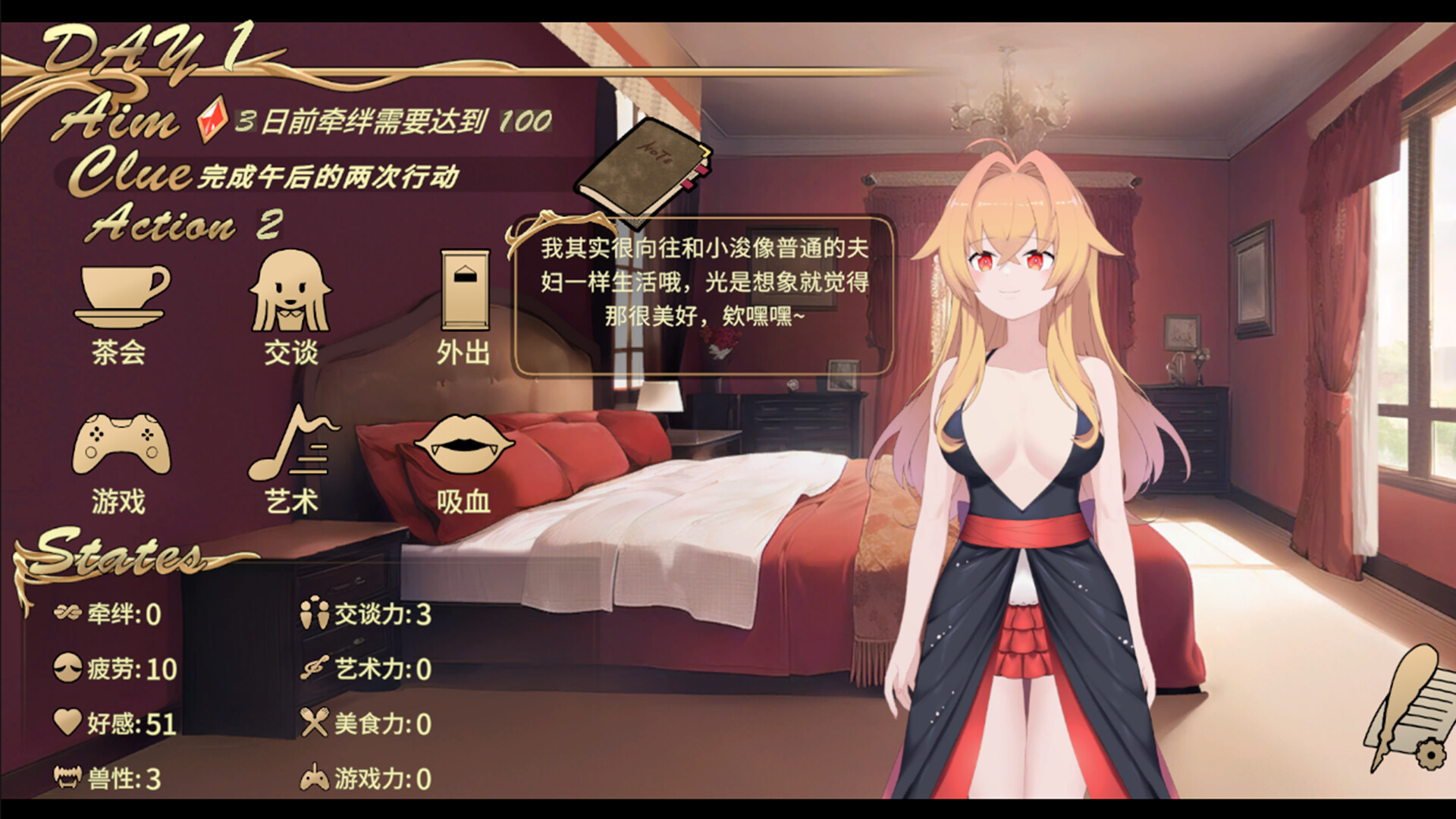尽管她竭力声称自己是个普通人,但那昼伏夜出的习性,以及不时对你血液的渴望,都在暗示着她的身份并不普通。而在你脑海里偶尔浮现出的血腥场面,也仿佛在暗示着——这城堡中曾发生过一些可怕的事情。