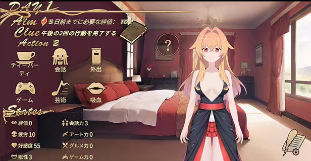 昼間は城でアイリーンと共に過ごす時間。彼女と過ごすことで特定の能力を育成したり、吸血させて疲労を解消したりできる。